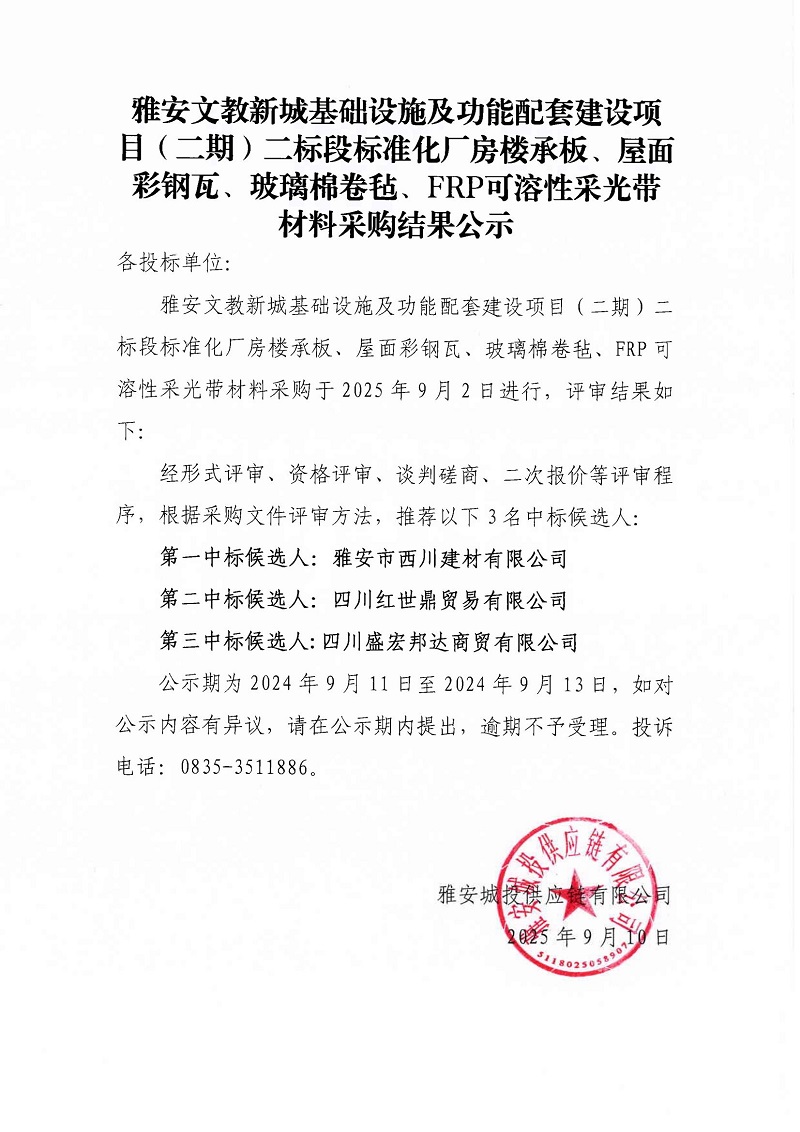 雅安文教新城基礎(chǔ)設(shè)施及功能配套建設(shè)項(xiàng)目(二期)二標(biāo)段標(biāo)準(zhǔn)化廠房樓承板、屋面彩鋼瓦、玻璃棉卷氈、FRP可溶性采光帶材料采購結(jié)果公示