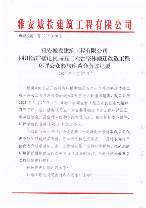 雅安城投建筑工程有限公司四川省廣播電視局五二六臺(tái)整體搬遷改造工程環(huán)評(píng)公眾參與座談會(huì)會(huì)議紀(jì)要