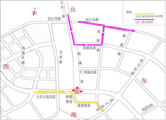 2.大興老場(chǎng)鎮(zhèn)片區(qū)前往大興二橋方向車輛:老場(chǎng)鎮(zhèn)-春暉路-思源東路-大興二橋