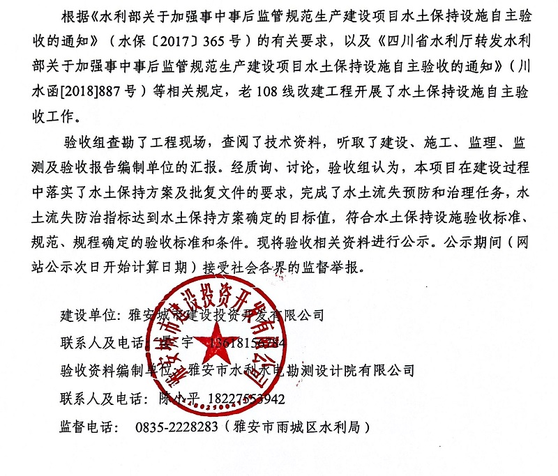 關(guān)于老108線改建工程水土保持設(shè)施自主驗(yàn)收情況的公示